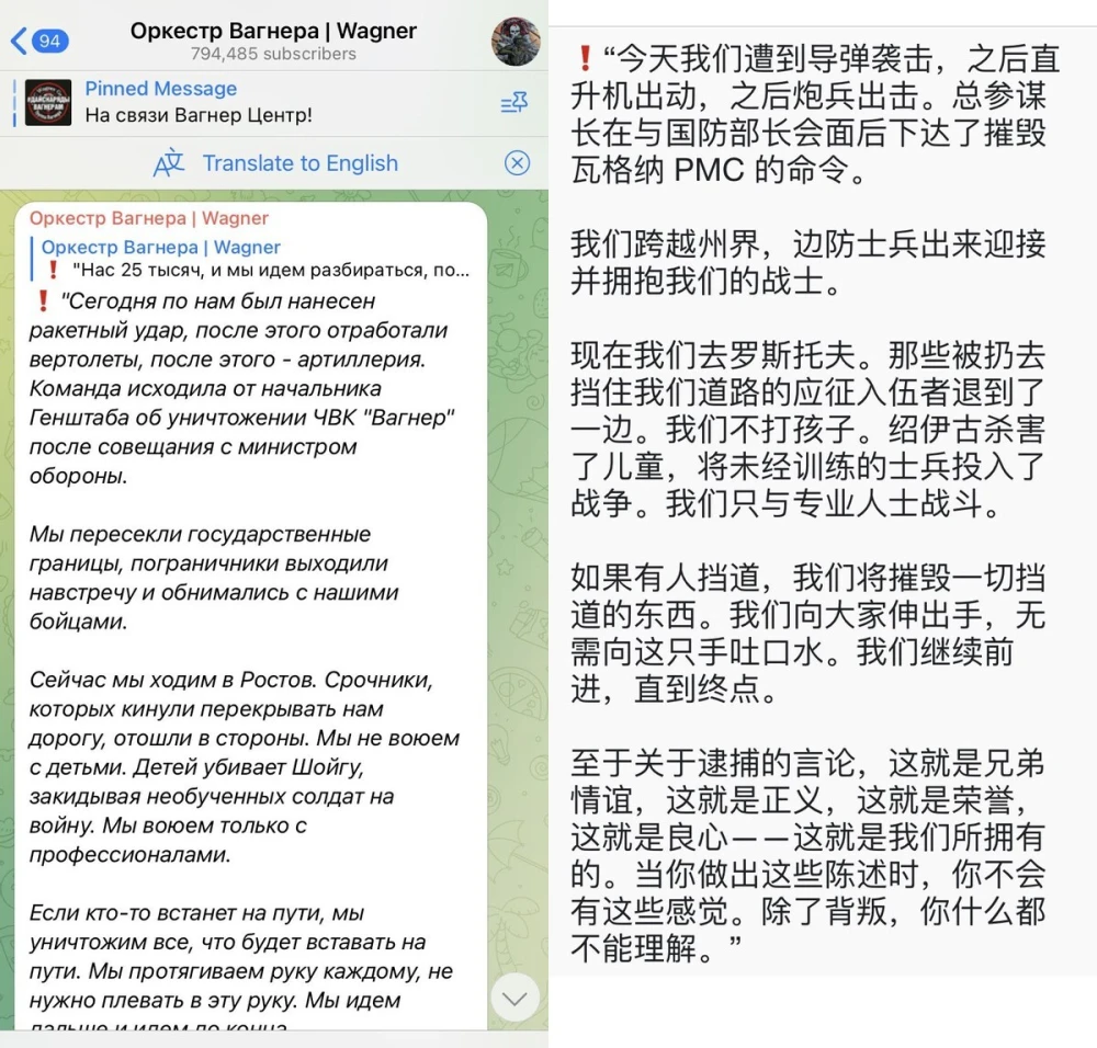 第四、从俄罗斯人爱用的电报频道传播出来的消息看,挥师俄罗斯罗斯托夫市的,不仅是瓦格纳雇佣军,还有与瓦格纳驻地较近的俄罗斯其他部队的士兵,据称面对乌克兰军队越来越猛烈的炮火,面对几分钟前还在聊天,几分钟后战死的战友,不少俄军士兵越来越厌战,俄军督导队射杀后退俄军的事件也越来越多,导致数千俄罗斯国防部的军人也追随瓦格纳雇佣军一同兵变。