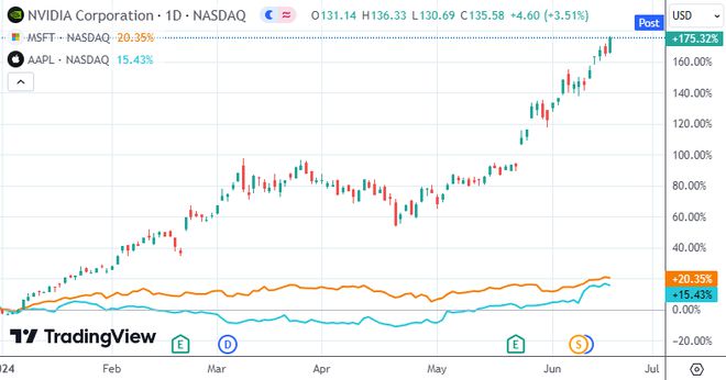 “三巨头”的年内走势也反应了这一点,苹果股价是在端午WWDC后才获得了动能,年初至今累涨11%;与OpenAI关系紧密的微软稳步走高,累涨19%;相比之下,英伟达要明显强势得多,年内涨幅达173%。