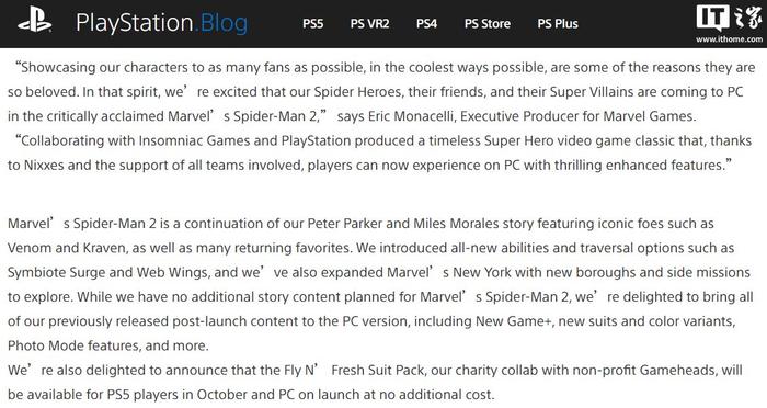 索尼 PlayStation 官方也于 10 月 19 日发布《漫威蜘蛛侠 2》 PC 版预告片。