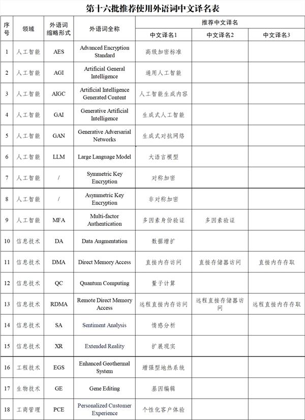据教育部消息,近日,外语中文译写规范部际联席会议专家委员会审议通过第十六批18组推荐使用外语词中文译名。