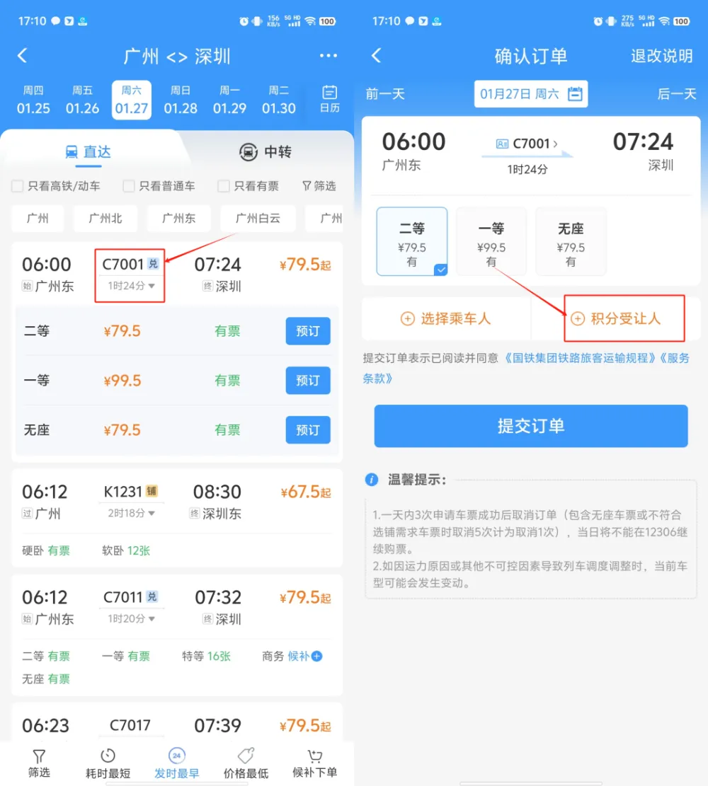 那找到有「兑」字样的列车,进入预订页填写「积分受让人」就可以享受免费乘车啦。