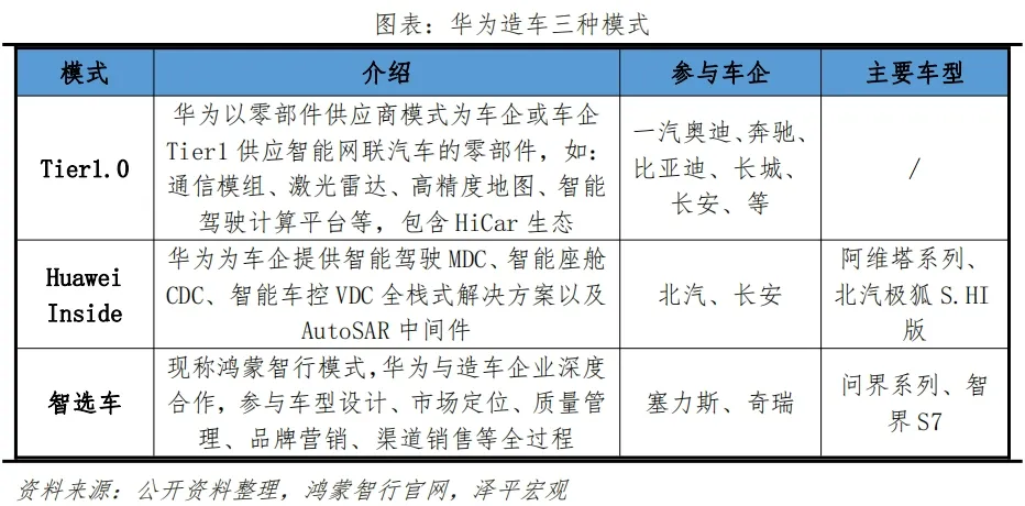 华为造车生态在2023年发生结构转变,更集中、更专业、更专注。从过去参与汽车产业的三种模式:一级供应商模式、Huawei Inside模式、智选车模式,转变为更专注的模式——实质上是“鸿蒙智行生态+车BU赋能”的统一生态。鸿蒙智选目前以问界与智界两大品牌为主,阿维塔品牌作为长安参与HI模式的外延,更有可能成为车BU独立后和长安等企业合资的组成部分。赛力斯、奇瑞、江淮、北汽等车企也收到了车BU开放股权邀请。