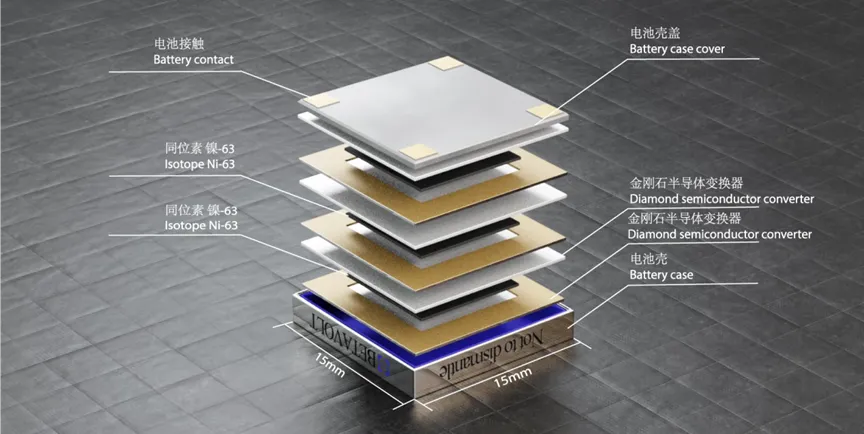 北京贝塔伏特研发的核电池也是一种辐射伏特效应电池,通过放射源镍-63发射的β粒子(电子)的半导体跃迁产生电流。