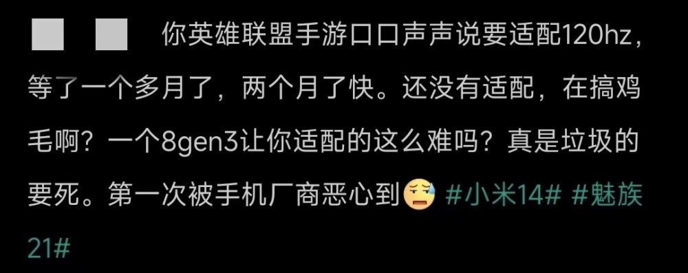 不过,按照酷安网友们的反馈,目前魅族21依然无法开启《英雄联盟手游》120hz模式,很多热门手游的厂商也没有对这款产品做适配,空有一身硬件性能却发挥不出来。