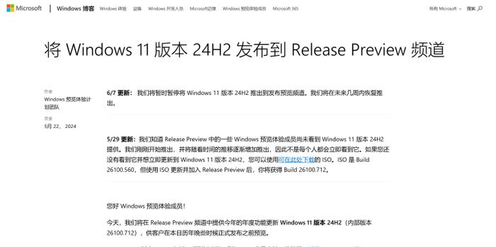 微软此前已经在正式公布了下一代Windows 11 24H2版本的各项功能,并且联合多家厂商公布了支持相关功能的全新Windows AI PC。此前,微软已经开始在 Release Preview 频道上向 Windows Insiders推出的Windows 11 24H2抢先体验版本,不过外媒发现,微软目前已经悄悄暂停了相关版本的更新。这次暂停是通过在原始发布博客中添加内容的方式宣布的。