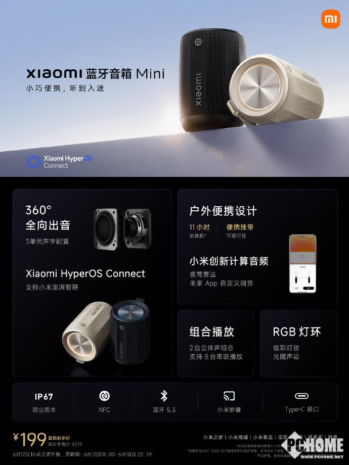 6月12号消息,小米官宣小米蓝牙音箱Mini浅咖色今日首销,618期间到手价199元。小米蓝牙音箱Mini拥有11小时长续航,采用3单元声学配置,支持小米澎湃智联。