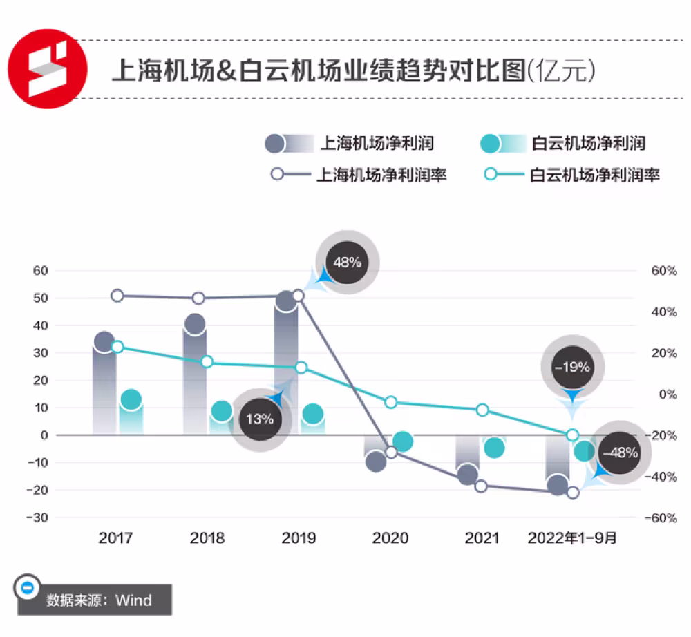 同行业比较来看,上海机场的净利润从2019年的52.61亿元降至2022年前三季度的亏损20亿元,净利率则从48%跌至-48%,相比更聚焦国内航空性业务的白云机场,上海机场不论是业绩变化还是盈利能力波动,都更为剧烈。
