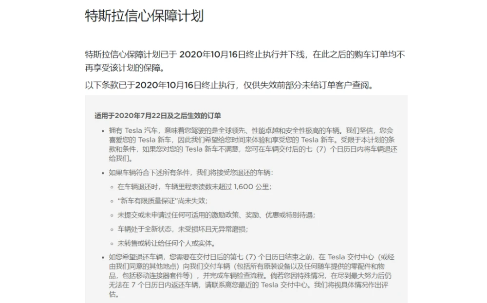 多次调价后,2020年7月22日,特斯拉上线“信心保障计划”,符合条件的车主都享有交付后7日内退车的权利,但该计划实行不到三个月,便在当年10月16日终止执行并下线。计划实施期间,10月1日特斯拉宣布降价,依旧有不少9月提车的车主前往线下门店维权。