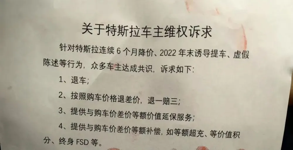 1月7日,有博主爆料称,特斯拉成都太古里店爆发激烈维权。现场维权的用户还联名写诉求、按手印,要求特斯拉赠送10万公里超充、100万积分、终身FSD(完全自动驾驶)和2-4年延保。根据估算,车主要求赠送的服务价值总额约16万元,远超本次降价幅度。
