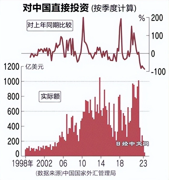 彭博社或者日经新闻的消息称,根据中国国家外汇管理局的统计显示,外国资本2023年4~6月对中国的直接投资金额为49亿美元。与去年同期相比的降幅达到87%,创出新低。